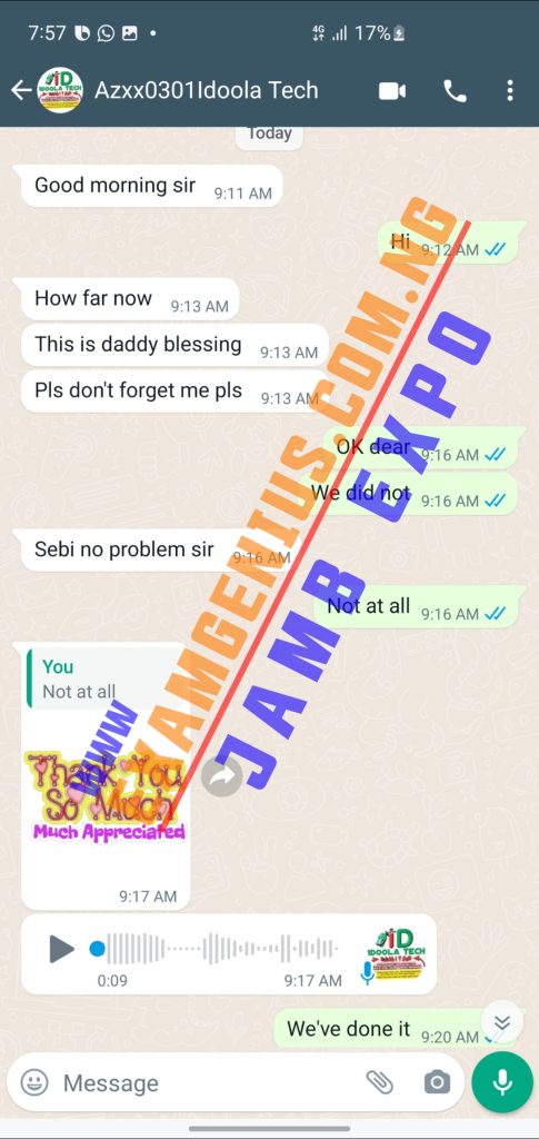Proven JAMB Expo Runs Success Stories from Our Students. Choosing the right JAMB runz (runs) expo site can make all the difference between repeated attempts and outstanding success. Over the years, educlaz.com have remained committed to one goal: helping candidates score high and gain admission into their dream institutions. Today, we are proud to showcase the results and testimonies of our past candidates who trusted our unbeatable JAMB expo asst, Jamb runs (runz) and JAMB questions and answers delivery.